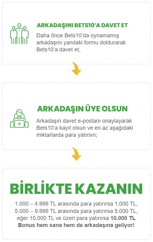Daha önce Bets10’a kayıt olmamış arkadaşın, resmi sitede yer alan formu doldurarak davet et, Arkadaşın davet e-postanı onaylayarak kayıt olsun ve en az aşağıdaki miktarlarda para yatırsın;